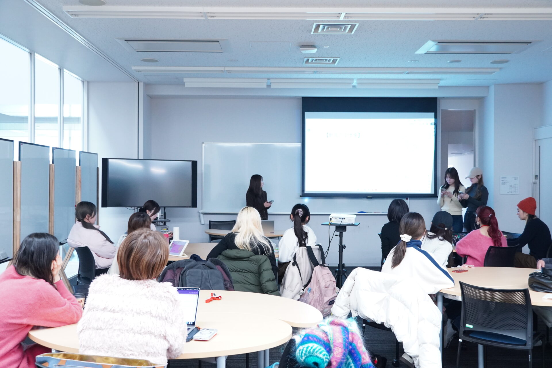 2026/02/13 3カ月の成果のお披露目!英文学科プロジェクト科目bにて、映像制作会社ピクス(P.I.C.S.)とのコラボ授業で制作された動画の完成披露試写会が行われました。 (1/6)