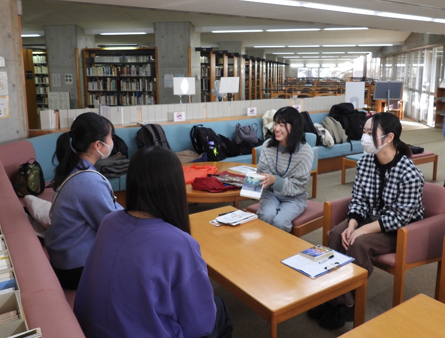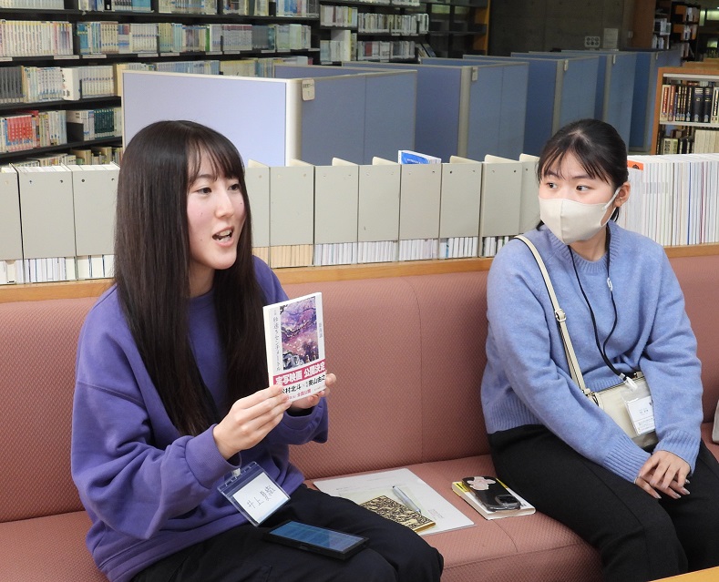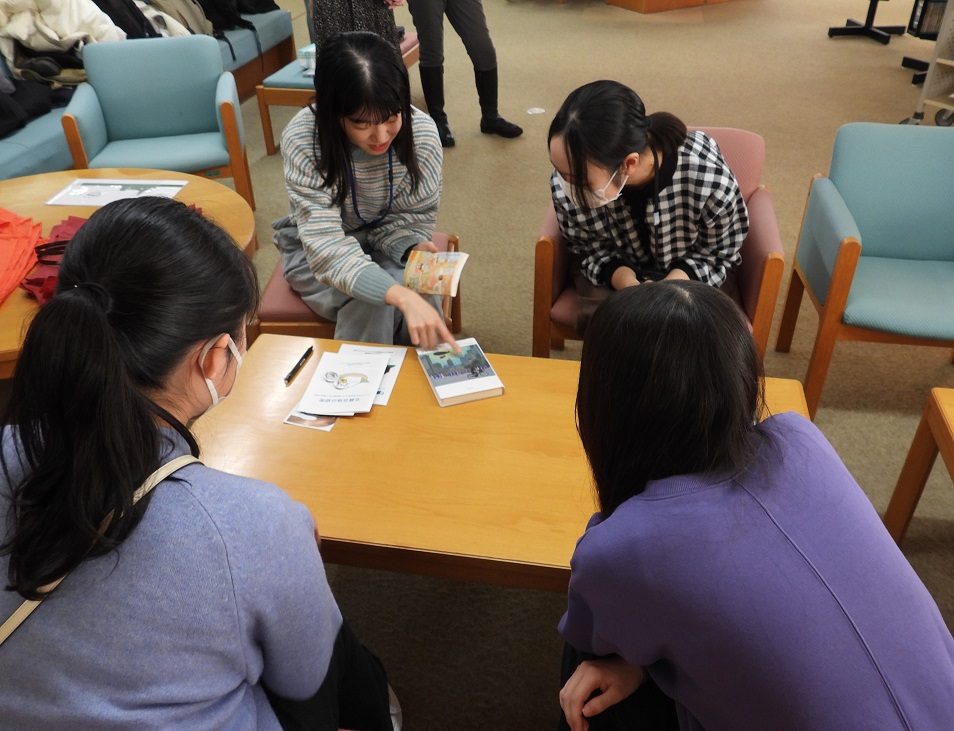 ブックトークの内容を通じて交流を行いました。本の読み方やおすすめのポイントを聞く中で、互いの大事にしている価値観(挑戦する勇気、地域の生活と課題感、コミュニケーションでのユーモア)を共有することができました。(実践女子大学図書館学生スタッフららすた)