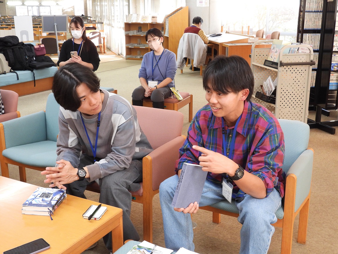 テーマは『おすすめ本』として設定し、両大学の学生たちは、事前に準備してきました。ららすた学生の提案で2グループに分かれ、3~5分程度で本の紹介をし、その後、みんなで質問や感想を言い合うスタイルでおこないました。