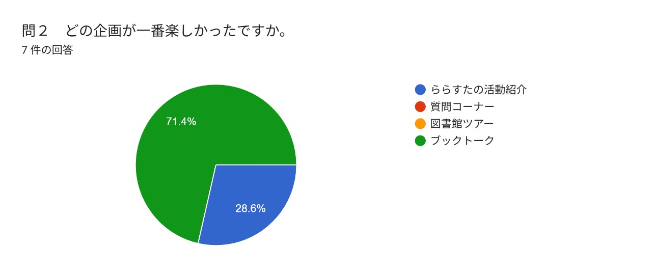 ブックトークが面白かったです。青山学院大学の学生は普段読まないジャンルの本を紹介しており、新しいジャンルを読みたいなと思うきっかけになりました。また、同じららすたのメンバーの知らない一面を知ることができました。(実践女子大学図書館学生スタッフららすた)