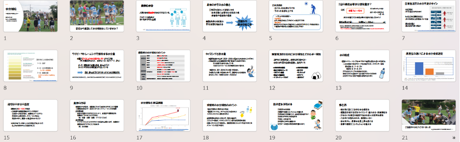 本学研究室において、男子ラグビー部員を対象に水分補給をテーマにパワーポイントにて栄養セミナーを実施した。(資料①水分補給セミナーパワーポイント資料)