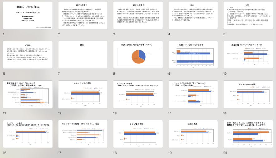 アンケートは、12月に発表した同研究室の管理栄養士専攻と合同で作成した用紙を使用した。「葉酸の名前」は今回、初めて知った学生も含めて多くの学生が知っていると回答した。「葉酸の働き」を知っていると回答した学生は27%と少なかった。桜カフェで提供したおにぎり、ブロッコリーチーズあえ、フルーツグラノーラとキウイフルーツは、いずれも「美味しかった」、「簡単」、「作ってみたい」との意見が多くを占めた。レシピ集は「役に立った」と多くが回答した。