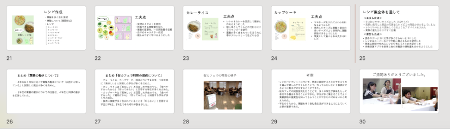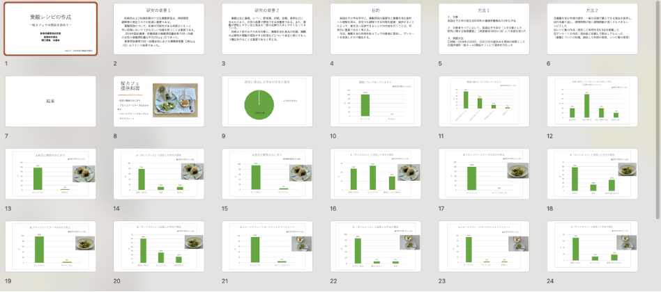 桜カフェで試作品の提供とともに料理の幅を広める工夫を行った。試作品の味や見た目について、作り方などを紹介したレシピを配布し、アンケートを行なった。実践女子大学倫理委員会にて承認された(承認番号2024-20)。