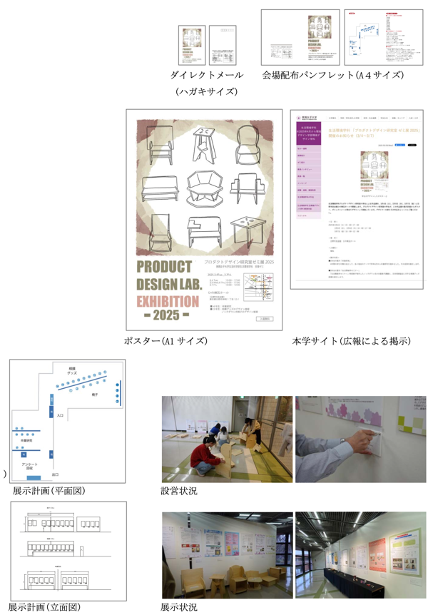 卒業研究と生活環境セミナーの成果物を「実践女子大学 プロダクトデザイン研究室 ゼミ展 2025」として、「ひの煉瓦ホール」(日野市民会館)展示室にて展示した。 展示内容は、3 年生のゼミ活動にあたる「生活環境学セミナー」、4 年生は「卒業研究」の成果をそれぞれ展示。3 年生の「生活環境学セミナー」では、前期の課題であった釘や接着剤を使わない“ノックダウンチェア”で制作した原寸大の椅子 10 点とその説明パネルを展示。また、後期の課題であった日本相撲協会への相撲グッズの提案のプロトタイプと説明パネルを展示。4 年生は通年で実施した「卒業研究」の制作物とその説明パネルを展示した。
