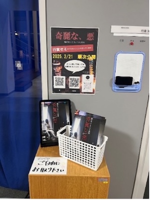 ① 校内への掲示や、映画館でのフライヤー及びティッシュ配布