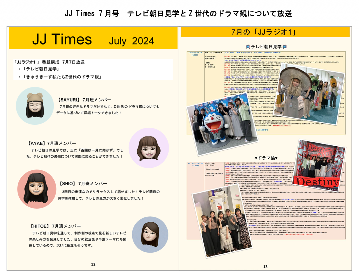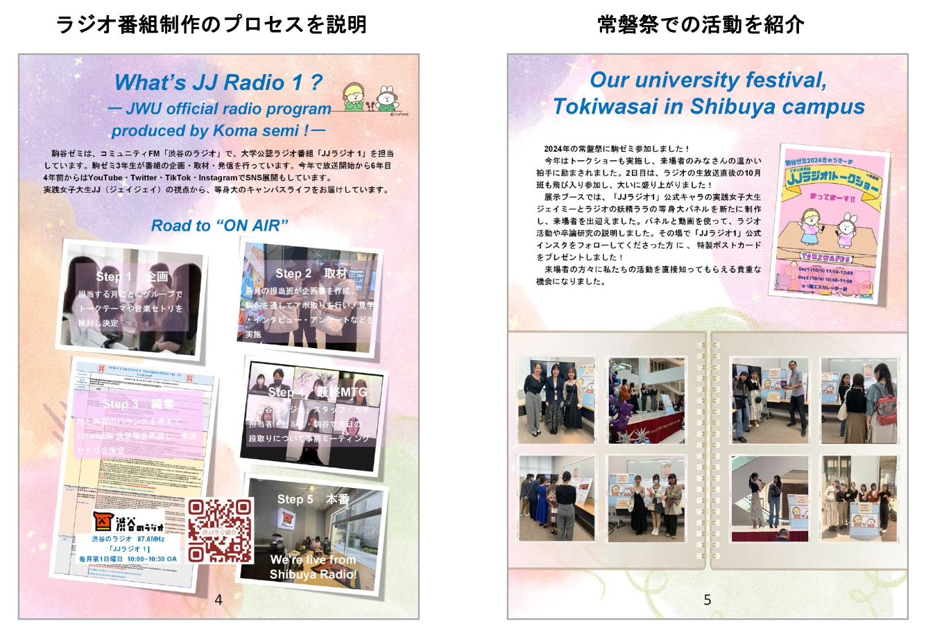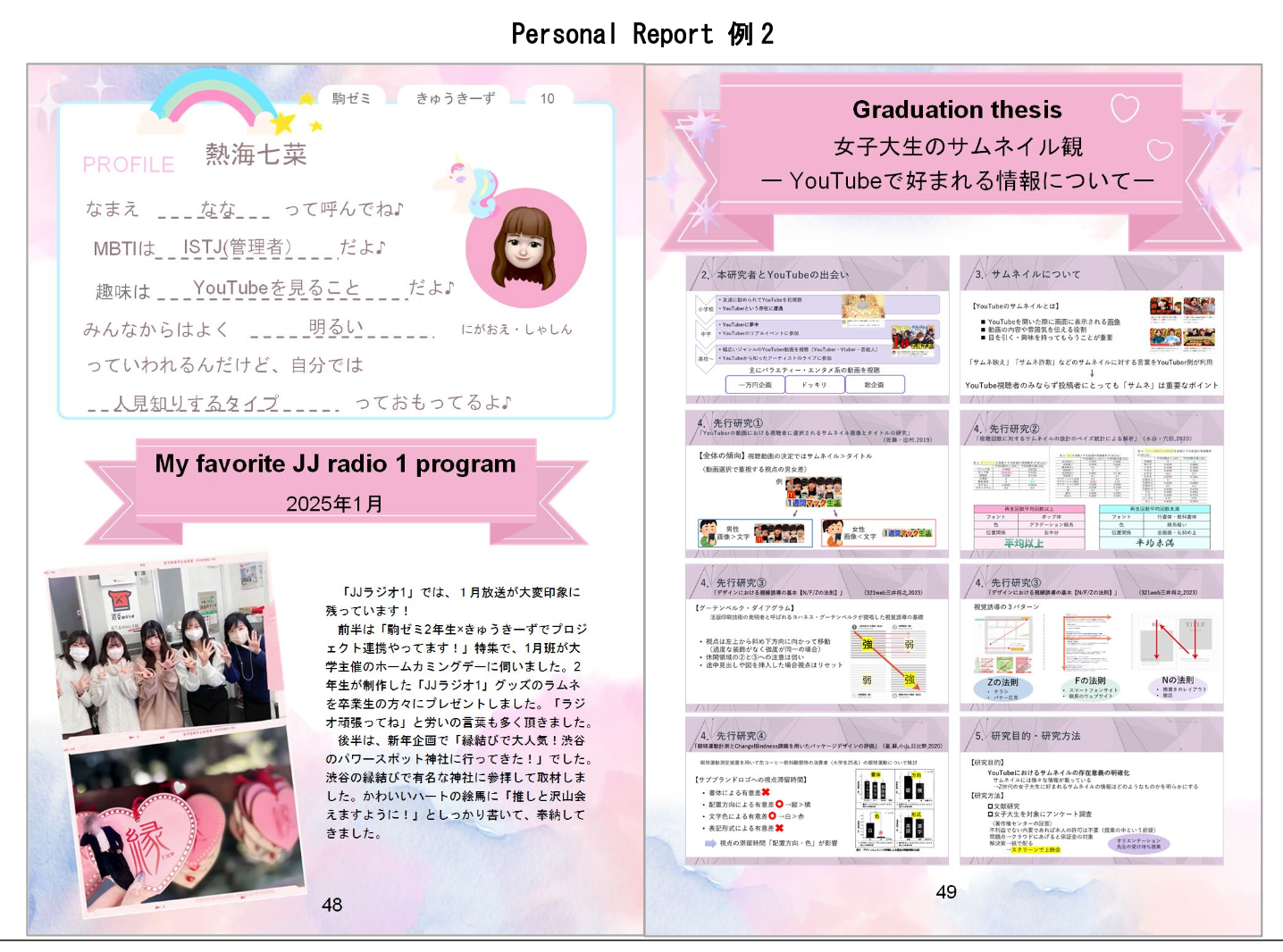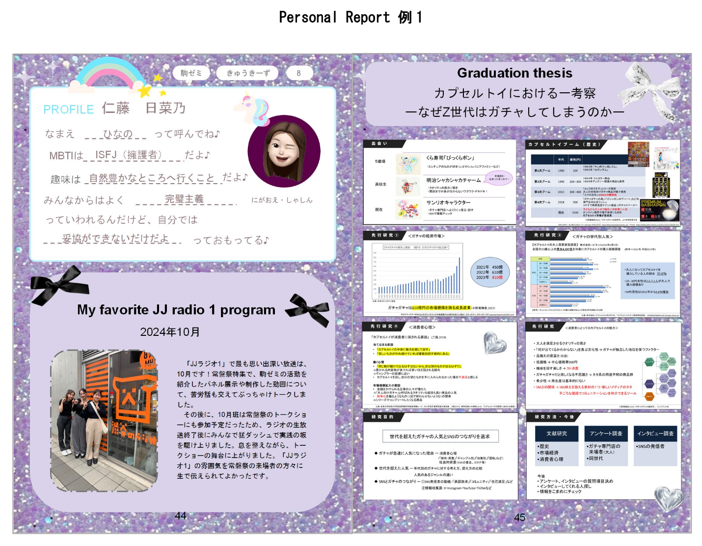 このゼミブック (全 56 頁) は、 2024 年度のゼミ活動の総括として、 編集委員 5 人が中心となり企画から編集まで制作した。2 部構成になっており、前半の JJ Times では「JJ ラジオ 1」の毎月の Timetable と担当者のコメントを、後半の Personal Report ではメディア活動の振り返りと個人の卒論研究をまとめている。