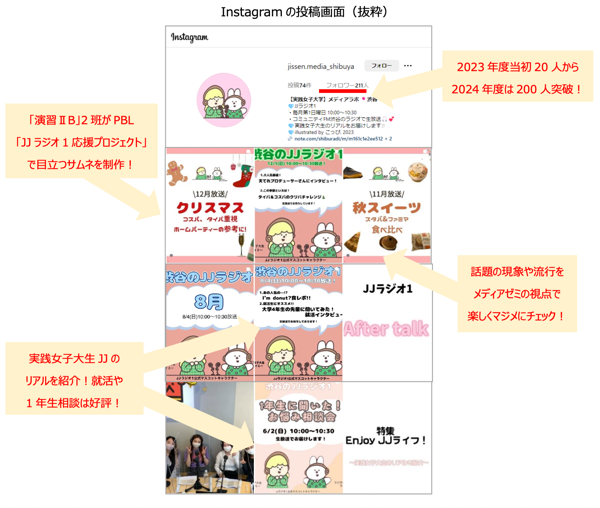 2024年度の活動は、Radioを核に多角的にInstagram/Archive/Journal/Booklet/EventをCircular(循環)プロジェクトとして実践する。実践女子大生JJのリアルを複合メディアで発信する。更にBookletとEventは、ゼミ内で編集委員会とイベント委員会を立ち上げ運営していく。
