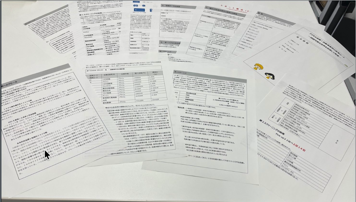 ゼミでは、航空機墜落事故や原子力発電所の事故に対する株主代表訴訟の判例を分析する等して、ビジネスの実務について知識を深めた。以上の活動から得た知識を使って株式投資レポートを作成した。第一に、解決したい社会的課題を投資テーマとして選び、バーチャル株式投資システム上で 10~20 銘柄でポートフォリオを構成した。バーチャルシステム上の仮想資金 500 万を 10~20 銘柄の会社の株式に投資し、数か月間、運用した。経済や政治、国際情勢等による株価への影響や各銘柄の株価の推移を分析するとともに、各会社の有価証券報告書で ROE 等の会社の業績を示す財務指標やサステナビリティへの取り組み等の戦略を分析し、株価を予測した。