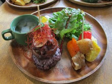 昼食は、地元のさつまいも農家が経営する「OIMO cafe(おいもカフェ)」で、さつまいもと地場産野菜を使ったランチプレートを味わいました。「OIMO cafe」では店舗の裏にある農場(むさし野自然農場)を見学するとともに、農産物の生産に加え加工や流通・販売までの農業の6次産業化に取り組んでいるオーナーの武田幸太郎さんへのインタビューを行いました。