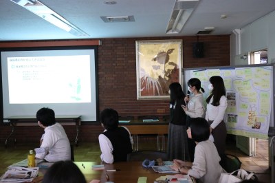 続いて、本学の学生4名が、事前にまとめたスライド資料を用いてプレゼンを実施。子どもが楽しめる場所、保護者が安心できる場所、中高生を支援する場所として、子育てひろばにどのような機能や環境構成が必要か、授業やゼミで学んだ知見を生かしたアイデアを参加者にわかりやすく説明しました。