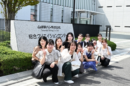 生活科学部食生活科学科食物科学専攻(2026年4月から食科学部食科学科食デザイン専攻)3年生を対象とした授業「食産業演習」の学外研修で、11人の学生が8月28日、中川裕子准教授の引率のもと、山崎製パン総合クリエイションセンター(千葉県市川市)を訪問。製パン・和菓子・洋菓子・加工食品・米飯の技術開発室や食品分析・品質評価研究室を見学しました。実際に研究に携わる社員の皆さんから直接お話をうかがい、食品メーカーの研究開発の最前線に触れました。
