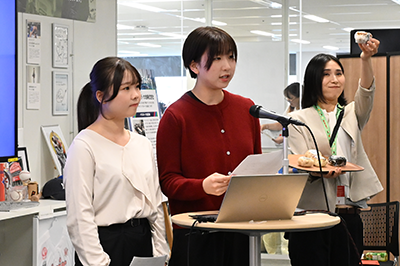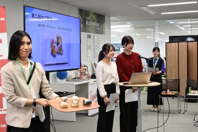 最後に登場したのが、本学の学生たちで、1カ月以上かけて2チームが開発したオリジナルおにぎりを紹介しました。国内チームが開発した「人参しりしりと鮭のおにぎり」「十六穀米使用 ツナタルタルのせカツおにぎり」と、グローバルチームが開発した「さつまいもとカシューナッツ入り 味噌焼きおにぎり」「だしとまいたけがやさしく香る トマニョタ炊き込みおにぎり」の計4種類のおにぎりについて、それぞれの特徴や開発に込めた想いを自分たちの言葉で語りました。
