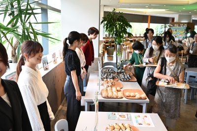 第二部は、「雨晴食堂」(オイシックス・ラ・大地株式会社のグループ企業であるシダックスコントラクトフードサービス株式会社が運営)に場所を移し、オリジナルおにぎりの試食会を開催。先に紹介した4種に加え、シンプルなのりおにぎりを含む全5種類が振る舞われました。試食した参加者からは「おいしい!」と称賛の声が上がり、学生たちへの取材も相次ぎ、しっかりと受け答えする姿が見られました。