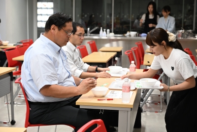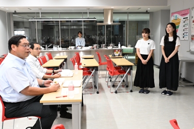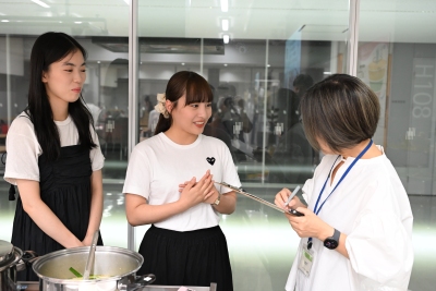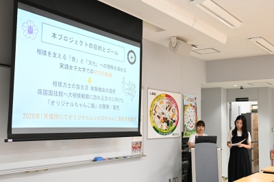 生活科学部食生活科学科健康栄養専攻(2026年4月から食科学部食科学科健康栄養専攻)の学生2人と公益財団法人日本相撲協会(以下「日本相撲協会」)が連携して進める「オリジナルちゃんこプロジェクト」の試食会が9月3日、本学の日野キャンパスで実施されました。当日は、日本相撲協会から、春日野部屋所属の竹縄親方(元栃乃洋関)が来校し、学生2人が考案した「ピリ辛豆乳ちゃんこ」と「和風カレーちゃんこ」を試食。「どちらもおいしく、甲乙つけがたい」「2人の工夫が詰まった優しい味」と高評価する声が上がりました。今後は、本場所での販売を目指して調整を進めていく予定です。