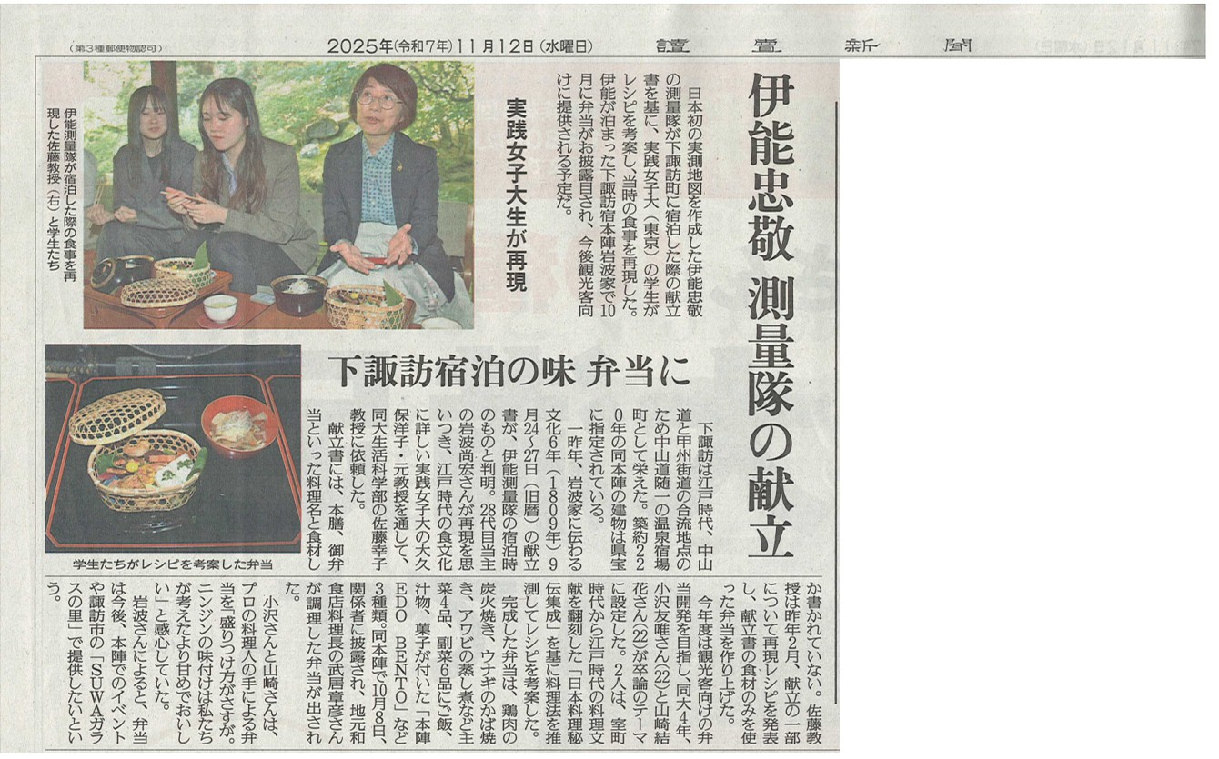 【『読売新聞』(2025年11月12日付)掲載】食生活科学科の学生が開発した「下諏訪宿本陣EDO BENTO」のお披露目会が長野・下諏訪町で開催!学生の試作品が地元の料理人の手で磨かれ、完成品に。(10/8)