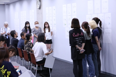 プレゼン後は日野キャンパス本館1階のキャンパススクエアに会場を移し、ワークショップ形式での講評会を実施。壁に掲示した各チームのプレゼン資料を見ながら参加者全員でアイデアを共有し、「ひのプロ」の3氏が学生たちにフィードバックを行いました。学生から個人的に推しているアイデアをアピールする場面もあり、対話を通して全員で実現の可能性を探りました。