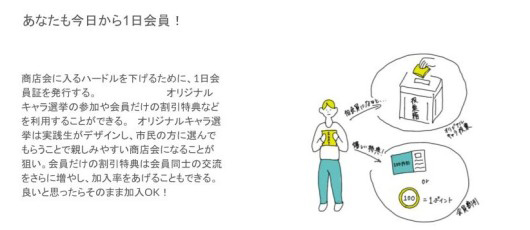 オリジナルキャラクター「のすけ」を考案し、「使える」「配りやすい」「楽しい」をコンセプトにしたグッズで商店会を盛り上げるアイデアを提案。