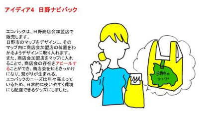 公共スペースである日野駅東口広場を活用して点在する商店会の店舗をつなぎ、にぎわいの発信源とするアイデアを提案。