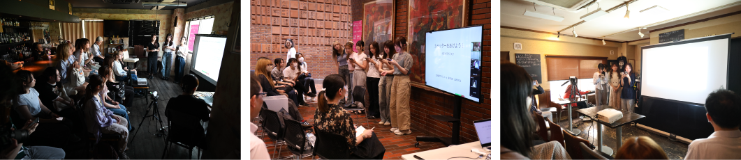 発表会は2部構成で、第1部は学生によるプレゼン。「街中での“ハプニングプレゼン”」をコンセプトに、日野市役所ロビー、日野駅前のリバーサイド(バー)、オステリア・リノ(イタリアンレストラン)の3拠点と日野キャンパスをZoomでつなぎ、合計4会場で実施しました。参加した学生は約60名。8チームに分かれ、3つの拠点から商店会活性化のアイデアを発表しました。