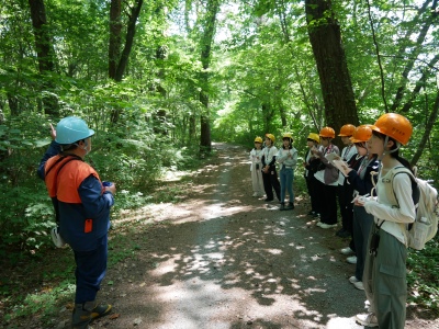 初日は、岩手大学農学部の山本信次教授と髙田乃倫予助教の協力のもと、岩手県内の植生や人と自然の共生について座学で学んだ後、同大学附属の寒冷フィールドサイエンス教育研究センター滝沢演習林を視察し、林業や自然環境への理解を深めました。かつては“雲上の楽園”と呼ばれた八幡平市松尾鉱山の跡地では、当時の生活記録を資料館で確認し、現存する集合住宅跡で時代と家族の変遷を実感。八幡平登山にも挑戦しました。