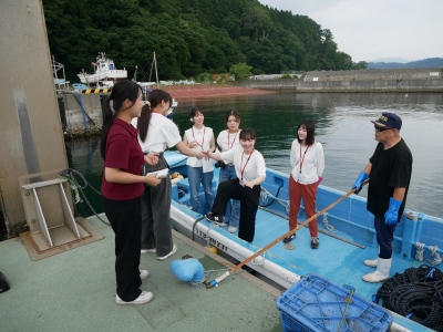 最終日は、釜石市箱崎の箱崎漁港へ。地元の漁師さんにお世話になって、漁船乗船体験 やウニの殻むき、 菜園訪問などを通して地域ならではの生活を学びました。午後には箱崎町の市民の皆さんへのグループインタビューも行い、地域の生活や漁業、製鉄業について貴重なお話を伺いました。