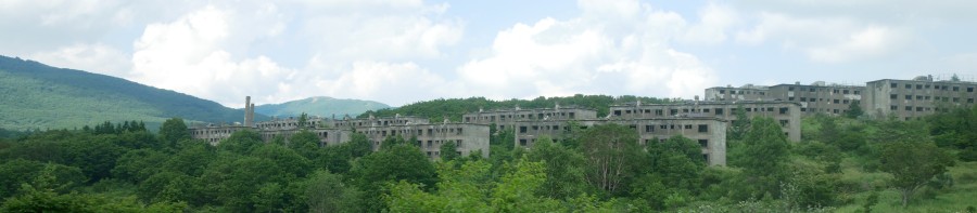 深い森の中に今なお立ち並ぶ松尾銅山の廃墟となった集合住宅