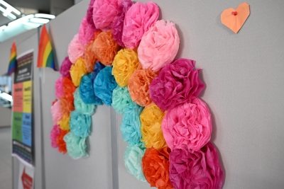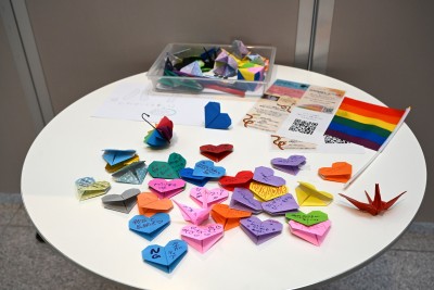 メイン会場となったエントランスホールでは、7色の紙の花で作った虹のオブジェが目を引き、その横には学生や教職員から集めたメッセージカードが並びました。また、来場者参加型のクイズ・スタンプラリーや多様なコーディネートを描くファッションバトル、LGBTQ+の方々への温かいメッセージを書いてもらうハート型の折り紙など、手作り感のある学生らしい企画が展開されました。これらは広井副学長のゼミの1年生27人が6グループに分かれて制作、運営を担いました。デイリーイベントとして2本の講演会のほか、オーストラリアのトランスジェンダーの中学生の生活を描いたテレビドラマ「ファースト・デイ わたしはハナ! 」も上映されました。同世代の理解を深めるべく、トライしやすいこうしたLGBTQ+関連の映画・ドラマ、コミックや絵本などを紹介するリーフレットも、広井副学長のゼミの3年生によって制作され、配られました。