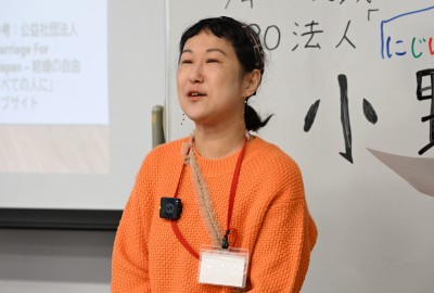 また、12月4日には、子育てするLGBTとその周辺をゆるやかにつなぐNPO法人「にじいろかぞく」の共同代表理事、小野春さんのトークイベントが行われました。小野さんは、同性カップルが結婚できない現況は違憲だと主張する「結婚の自由をすべての人に」訴訟の東京原告のひとりです。 同性のパートナーとお互いの連れ子3人のステップファミリーとして生活しており、家族の入院時の面会や手続き、死亡時の対応・相続などが戸籍上の血縁がないとできないことなど、多くの困難を具体的に挙げ、学生たちに理解を求めました。
