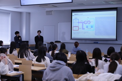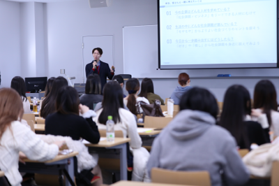 生活科学部現代生活学科・倉持一准教授が担当する「生活産業史」の授業では、さまざまな企業や組織の方を講師にお招きして、より実社会に即した学びを実践しています。2025年12月5日には、株式会社電通総研 ヒューマノロジー創発本部 Quality of Societyセンターの研究員お二人が日野キャンパスへ来校し、「社会と自分との距離を捉えなおそう」というテーマで授業が行われました。