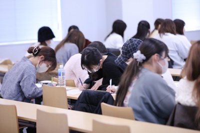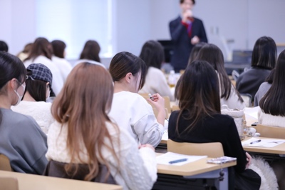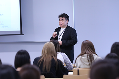 私は倉持ゼミにも入っているのですが、今回の授業も含め倉持先生の授業は、ただ聞いているだけでなく“一緒に考える”ことを重視しています。企業の方のリアルなお話は、学生には難しい内容も多いのですが、社会や企業の現状を学べるだけでなく、問題意識を持つ大切さにも気づけることが魅力です。本学は社会連携の活動が非常に多く、就活にも非常に役立つと感じています。(生活科学部 現代生活学科3年 池田 杏さん)