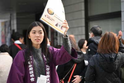 18日は、本学の公認団体「JJ相撲クラブ」のメンバーの大学生、高校生も販売ボランティアとして参加。順番まちで長蛇の列となっている様子や、おいしそうに「和風カレーちゃんこ」を食べる相撲ファンの表情に、メンバーたちも自然と笑顔に。なお、「JJ相撲クラブ」のメンバーは、「和風カレーちゃんこ」の販売のみならず、グッズ販売の手伝いや訪れた相撲ファンの誘導などのボランティアとしても活躍しました。