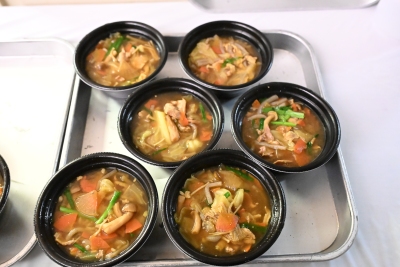 春日野部屋でのちゃんこ作りの見学に始まり、両国国技館内の施設運営を手掛ける国技館サービス株式会社(以下、国技館サービス)とのミーティングや度重なる試作を実施。「1日最大約2,000食」「1鍋で100人前」「販売価格は500円(税込)」「肉類以外の具材は固定」「少ない調理工数」という制約の中、学内での数回にわたる試食会を通して、レシピの開発に挑み、味の特徴やこだわりポイントを盛り込んだオリジナリティー豊かな「和風カレーちゃんこ」と「ピリ辛豆乳ちゃんこ」を開発しました。9月には竹縄親方らを日野キャンパスに招いて試食会も開催。「どちらもおいしく、甲乙つけがたい」と高評価を得て、その際にいただいたアドバイスを反映してさらにブラッシュアップをしました。最終的に採用されたのが、春日野部屋とのコラボによる「和風カレーちゃんこ」でした。実際の販売は、大相撲初場所初日の1月11日から18日までの1週間、東京・両国国技館で実現しました。