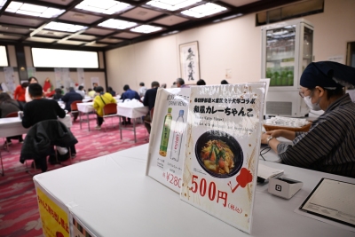 和風カレーちゃんこを食べる相撲ファンでにぎわう地下1階の大広間