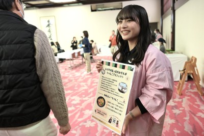 ちゃんこを食べ終えた人たちにアンケートの協力を呼びかける西﨑さん