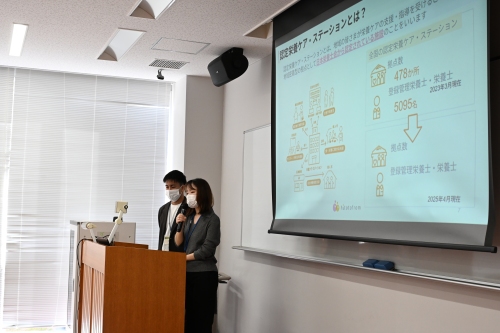 講義の前半、新井さんは「認定栄養ケア・ステーションは地域住民と管理栄養士をつなぐ拠点であり、専門知識を地域に還元できる貴重な場。管理栄養士の存在価値を向上させる起点ともなる」と説明。「どこに管理栄養士がいるかわからない」という課題については「栄養ケア・ステーションが果たす役割は大きい」と強調しました。また、「認定栄養ケア・ステーション」同士の横のつながりを構築しつつ、「地域住民に向けた介護予防教室や、料理教室などのイベントも実施していきたい」と今後の展望を語り、「大学には調理設備や教室など、コストを抑えて活動するためのリソースがたくさんある」とし、大学に「認定栄養ケア・ステーション」を設置するメリットにも触れました。