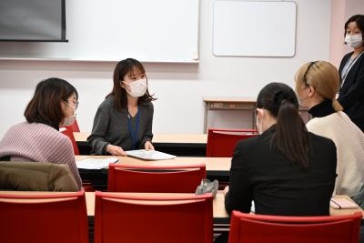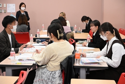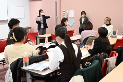 講義後は、参加した管理栄養士専攻の学生有志と講師による懇談の時間が設けられ、学生自ら作成した事業計画案の実現可能性などについて意見を交わしました。「内容の質が高い。子ども向けの提案は、大学周辺の地域性と合致している。すでに学生たちが行っている日野市での活動や産学連携事業との親和性も高い」などと講師に評価され、手応えを得た学生たち。対象を絞って計画を立てる重要性など貴重なアドバイスを受け、計画の再検討に向けた課題を確認しました。