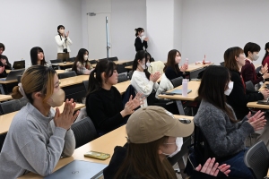 発表終了後には、渋谷区担当者による厳正な審査の結果、人間社会学部ビジネス社会学科2年、岩崎志保さん、生活科学部現代生活学科1年、冨山結さん、国際学部国際学科1年、正者茉彩子さんの3人グループ「カルテット」が作成した、「おにぎり」片手に朝の渋谷を散策し「朝活」観光をお薦めする「日本×朝活」という内容の動画が、最優秀作品に選ばれました。