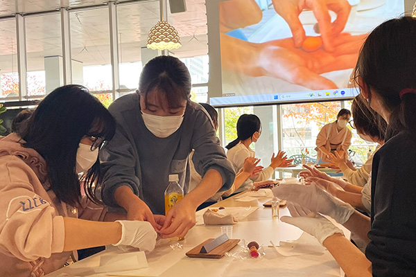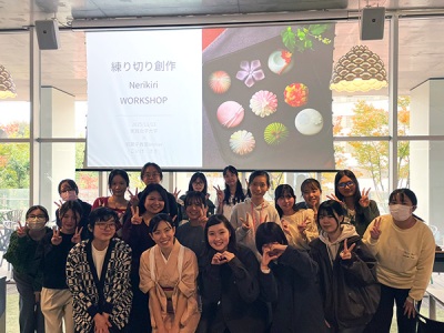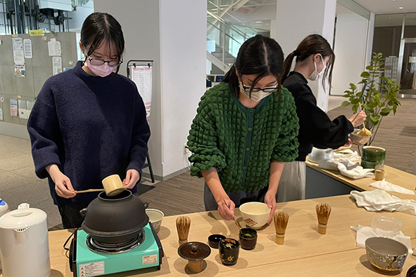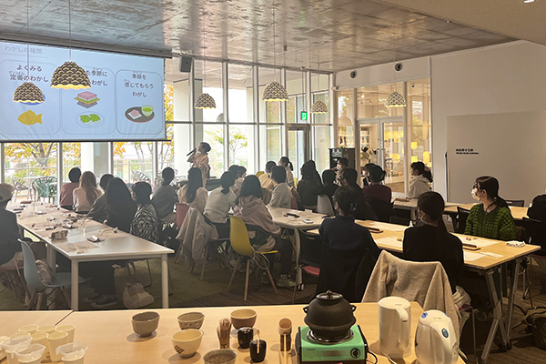 また、お抹茶の提供では本学裏千家茶道部にご協力いただき、点てたてのお抹茶と自分で作った練り切りを試食しました。お互いの練り切りを見せ合いながら写真を撮ったり語り合ったりするなど、終始賑やかな雰囲気に包まれました。