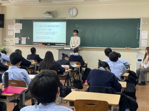 語学や教育について日々学ぶ本学の学生たちは、それぞれの留学体験を通じて感じた文化・価値観・生活環境の多様性について語り、生徒の皆さんは真剣に耳を傾けながら、熱心にメモを取っていました。