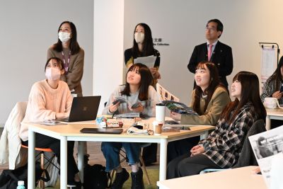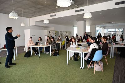 今回のプログラムは、フィジーの語学学校や留学プログラム「フィジー留学カラーズ」を運営する株式会社アールイーカンパニー(以下、アールイー社)の協力のもと、渋谷キャンパス、フィジー、アールイー社の本社がある大阪市をオンラインで結んで行われました。まず、来校した代表取締役の多田祐樹さんが口火を切り、フィジーを初めて訪れた時、各自のペースでおおらかに暮らす人々の姿に衝撃を受けたと強調。フィジーでは、幸せを感じながら働き、「自分の仕事を通じて多くの人に幸せを届ける体験ができる」と説明しました。