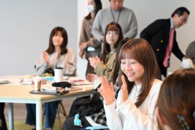 続いて、長瀬さんから「しあわせ=A×B」というシンプルな公式が提示され、学生に当てはまる言葉を考えてもらいました。「行動×つながり」「自分を愛せること×人との関わり」「自由×経験」などさまざまな回答が寄せられ、参加者それぞれが、自分の幸福を構成する要素の組み合わせが出されました。さらに、長瀬さんは「不安×感謝」のように、ネガティブな感情にポジティブな視点を掛け合わせることで、受け止め方が変わるケースもあるとも補足しました。こうした例を踏まえながら、学生は“幸せとは何か”を自分の言葉でとらえ直していきました。