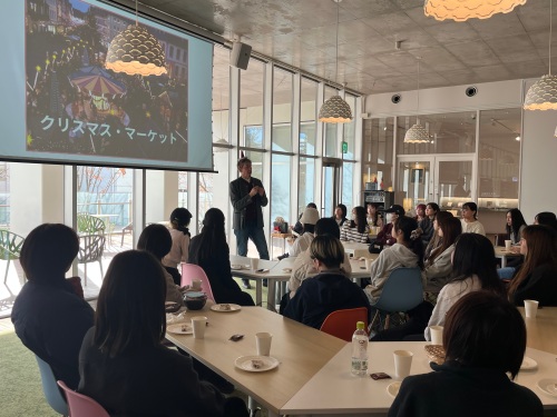 当日は約40名の学生が参加し、ドイツのクリスマスの定番菓子であるシュトーレンを味わいながら、講演に耳を傾けました。日本とは異なるクリスマスの過ごし方や、初めて知る文化や習慣に、学生たちは驚きとともに強い関心を示し、終始熱心に聴講していました。