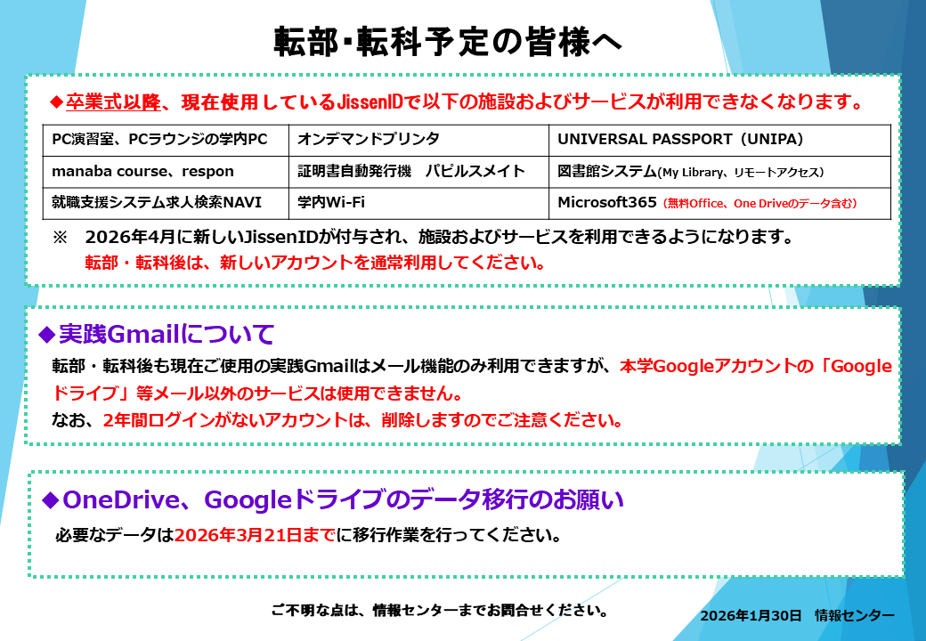 卒業式以降、現在使用しているJissenIDで以下の施設およびサービスが利用できなくなります。