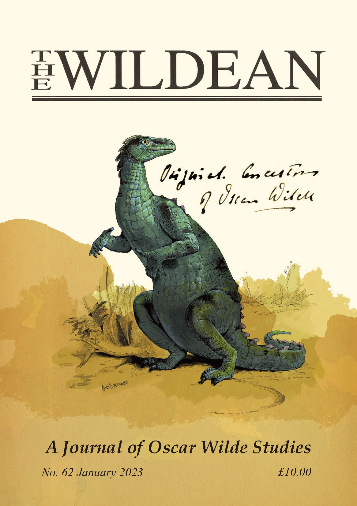 本学の英文学科で教鞭を執られた本間久雄博士が、今から1世紀近く前にイギリスの古書店で買い付けた、オスカー・ワイルドに関する新聞記事を集めたスクラップブック。ワイルド研究者のスチュアート・メーソンの所持していたその資料の中に、The London Illustrated Newsという新聞に掲載されたイグアノドンのイラストの切り抜きが含まれていました。ワイルドの同性愛行為を侮辱する目的で、ワイルドの恋人だったアルフレッド・ダグラス卿の父親・クイーンズベリー侯爵から送り付けられたこのイラストには、侯爵の直筆と思われる書き込みがされていました。土屋先生がクイーンズベリー侯爵の肉筆の解読を試みたことにより、このイラストは海外のワイルド研究者の注目を再び集め、現代風に彩色されて2023年1月に刊行された第62号の表紙を飾ることとなりました。