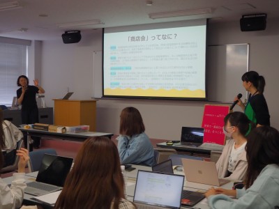 2. 大きなテーマである「世界で一番面白い商店会を作ろう!」の商店会に着目し、野村さんと一色先生が掛け合う形で、再度、商店会のことを詳しく説明し、現状を掘り下げていきました。