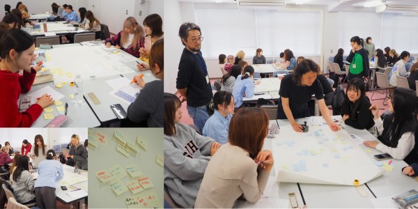 1年次に、ワークショップ演習を履修していた学生も多く、模造紙とポスターカラー、付箋を使って、上手に、それぞれの意見をグループ分けし、各自の班で出てきたキーワードや興味ある単語を取り出していきました。