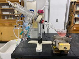 2週間後、第2回目の実験は、成分が溶け出たメタノール抽出液を『ロータリーエバポレーター』という機械を使って、濃縮していきます。