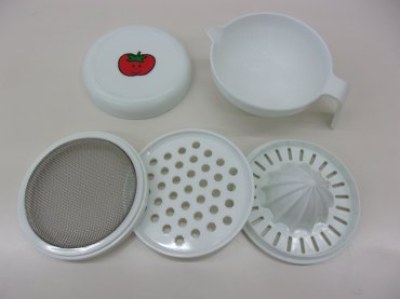 すり鉢、こし器、すりおろし器、しぼり器がセットになっています。