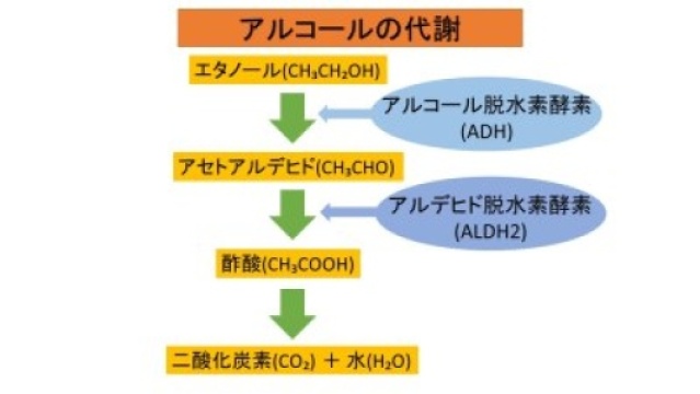 まず、アルコールはアルコール脱水素酵素の作用によりアセトアルデヒドに変わります。