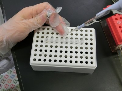 各自のゲノムDNAサンプルを、PCR溶液が分注された8連チューブに入れていきます。